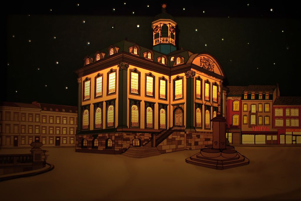 Cet édifice est un des plus luxueux de Verviers. Je l'ai reproduit en carton! Un travail de patience de plus de 60 heures depuis le dessin jusqu'à la réalisation de ce cadre illuminé. Toutes les fenêtres des maisons et de l'hôtel de ville sont rétro-éclairées pour reproduire cette ambiance féerique et charmante